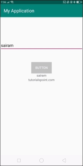 <?xml version="1.0" encoding="utf-8"?> <LinearLayout xmlns:android="http://schemas.android.com/apk/res/android" xmlns:tools="http://schemas.android.com/tools" android:layout_width="match_parent" android:layout_height="match_parent" android:orientation="vertical" android:gravity="center_horizontal" android:layout_marginTop="100dp" tools:context=".MainActivity"> <EditText android:id="@+id/edit_query" android:layout_width="match_parent" android:layout_height="wrap_content" android:hint="Enter string" /> <Button android:id="@+id/click" android:layout_marginTop="50dp" style="@style/Base.TextAppearance.AppCompat.Widget.Button.Borderless.Colored" android:layout_width="wrap_content" android:background="#c1c1c1" android:textColor="#FFF" android:layout_height="wrap_content" android:text="Button" /> <TextView android:id="@+id/text" android:layout_width="wrap_content" android:layout_height="wrap_content" /> <TextView android:id="@+id/text1" android:layout_width="wrap_content" android:layout_height="wrap_content" /> </LinearLayout>