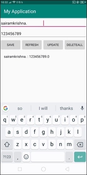 在上面的代码中,我们使用了姓名和薪资作为EditText,当用户点击保存按钮时,它会将数据存储到SQLite数据库中。点击刷新按钮以获取ListView的更改。