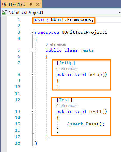 由于项目是在NUnit(.Net Core)上设置的,因此默认情况下会提供**Setup**和**Test**方法。