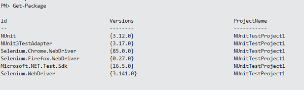 我们必须执行安装Selenium webdriver和NUnit所需的**程序包管理器**命令。
