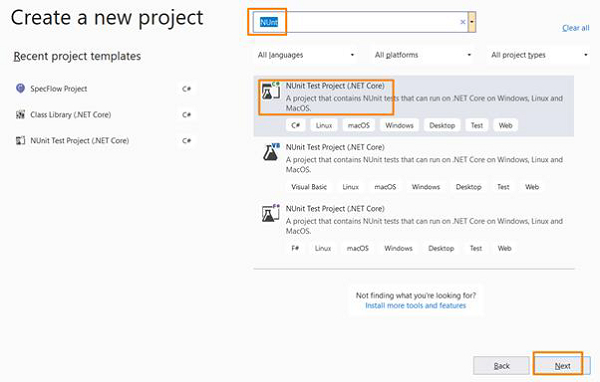 在**创建新项目**弹出窗口中出现的搜索框中输入NUnit。从搜索结果中选择**NUnit Test Project(.NET Core)**。