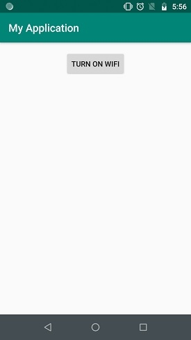 <?xml version = "1.0" encoding = "utf-8"?> <LinearLayout xmlns:android = "http://schemas.android.com/apk/res/android" xmlns:tools = "http://schemas.android.com/tools" android:layout_width = "match_parent" android:layout_height = "match_parent" android:layout_margin = "16dp" android:orientation = "vertical" tools:context = ".MainActivity"> <Button android:text = "Turn on wifi" android:id = "@+id/button" android:layout_width = "wrap_content" android:layout_height = "wrap_content" android:layout_gravity = "center" /> </LinearLayout>