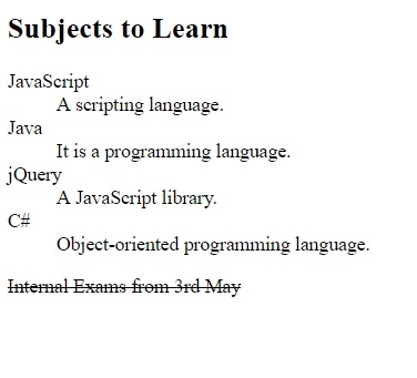 <!DOCTYPE html> <html> <body> <h2>Subjects to Learn</h2> <dl> <dt>JavaScript</dt> <dd>A scripting language.</dd> <dt>Java</dt> <dd>It is a programming language.</dd> <dt>jQuery</dt> <dd>A JavaScript library.</dd> <dt>C#</dt> <dd>Object-oriented programming language.</dd> </dl> <lp><del cite="exams_cancelled.htm">Internal Exams from 3rd May</del></p> </body> </html>