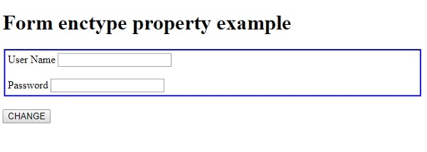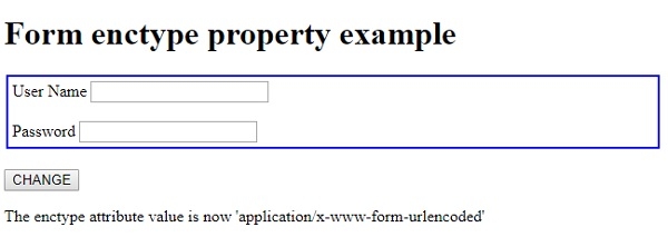 changeEnc() 方法使用 getElementById() 方法获取表单元素,并将其 enctype 属性设置为“application/x-www-form-urlencoded”。这使得所有字符都被编码,并且是默认的 enctype 编码。使用 id 为“Sample”的段落的 innerHTML 属性,我们通过向用户显示文本来说明此更改: