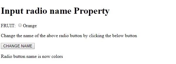 document.getElementById("Sample").innerHTML = "Radio button name is now colors";