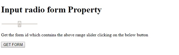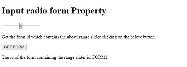 我们创建了一个输入字段,包含在表单内,类型=“range”,ID=“RANGE1”,名称=“VOL”。该表单的 ID 属性设置为 “FORM1” −
