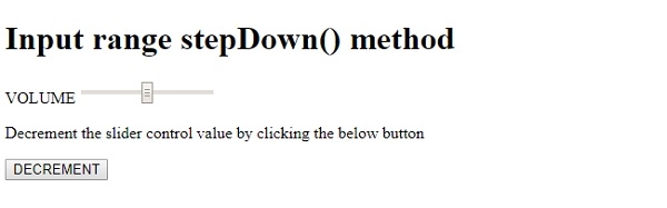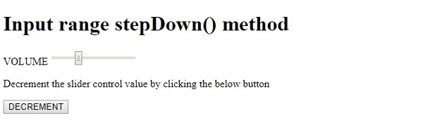 stepDecrement() 方法使用 getElementById() 方法通过向其传递 id “RANGE1” 来获取具有范围类型的输入字段,并在其上调用 stepDown() 方法,并提供 10 作为减小值。这将使滑块减小 10 -