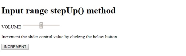 stepIncrement() 方法使用 getElementById() 方法,通过传递 id“RANGE1”获得类型为范围的输入字段,并在输入字段上调用 stepUp() 方法,传入 10 作为增量值。这会将滑块增大 10 -