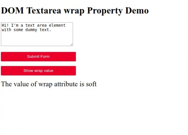 document.querySelector('.show').innerHTML = "The value of wrap attribute is " + document.querySelector("textarea").wrap;