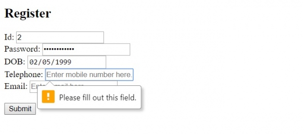 假设我们在不填写 ID、密码和电话这 3 个字段的情况下点击“提交”按钮,那么表单将不会提交。我们在这里未填写“电话”字段,因此将出现一个错误,该错误将不允许我们提交表单 −