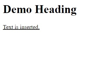 <!DOCTYPE html> <html> <body> <h1>Demo Heading</h1> <ins cite="new.htm">Text is inserted.</ins> </body> </html>