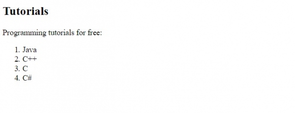 <!DOCTYPE html> <html> <head> <meta name="description" content="Learn for free"> </head> <body> <h2>Tutorials</h2> <p>Programming tutorials for free:</p> <ol> <li>Java</li> <li>C++</li> <li>C</li> <li>C#</li> </ol> </body> </html>