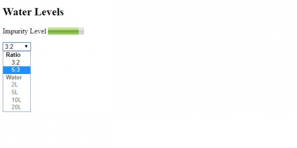 <!DOCTYPE html> <html> <body> <h2>Water Levels</h2> <p>Impurity Level <meter min="0" low="50" high="95" max="100" value="85"></meter></p> <select> <optgroup label="Ratio"> <option value="one">3:2</option> <option value="two">5:3</option> </optgroup> <optgroup label="Water" disabled> <option value="low">2L</option> <option value="Medium">5L</option> <option value="high">10L</option> <option value="veryhigh">20L</option> </optgroup> </select> </body> </html>