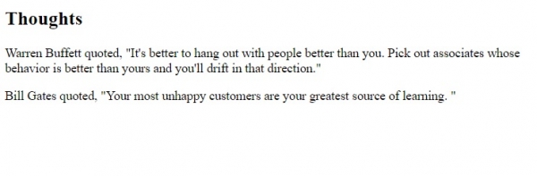 <!DOCTYPE html> <html> <body> <h2>Thoughts</h2> <p>Warren Buffett quoted, <q>It's better to hang out with people better than you. Pick out associates whose behavior is better than yours and you'll drift in that direction. </q></p> <p>Bill Gates quoted, <q>Your most unhappy customers are your greatest source of learning.</q></p> </body> </html>