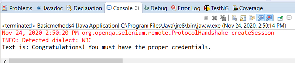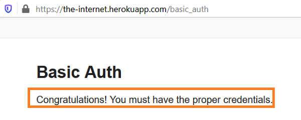 一旦正确输入了用户名和密码,并且单击了确定按钮,我们应该被导航到带有文本恭喜!您必须拥有适当的凭据的实际页面。