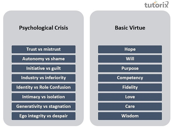身份认同感 vs. 角色混乱定义了身份认同感 vs. 角色混乱的概念。以下是他的各个阶段及其相应美德的简要概述: