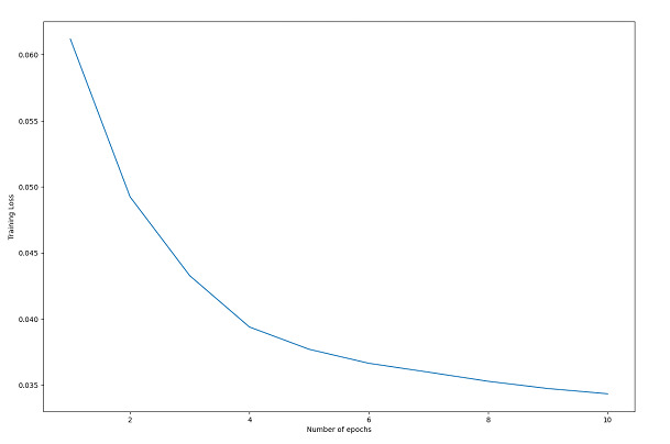 我们正在训练一个自编码器模型来学习图像的压缩表示。训练循环总共遍历数据集10次。