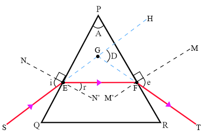 标记正确的角度是:折射角(∠r)、顶角(∠A)和偏转角(∠d)。