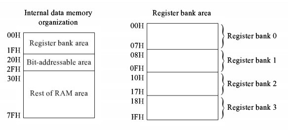 8051 的内部数据存储器分为两部分:一组八个寄存器和一个暂存器存储区。这八个寄存器为 R0 到 R7。地址范围 00H 到 07H 用于访问这些寄存器,其余部分为暂存器存储区。