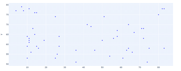 import numpy as np import random import plotly import plotly. express as px x = np.random.randint(low=1, high=84, size=50) y = np.random.randint(low=51, high=80, size=50) fig = px.scatter(x=x, y=y) fig.show()
