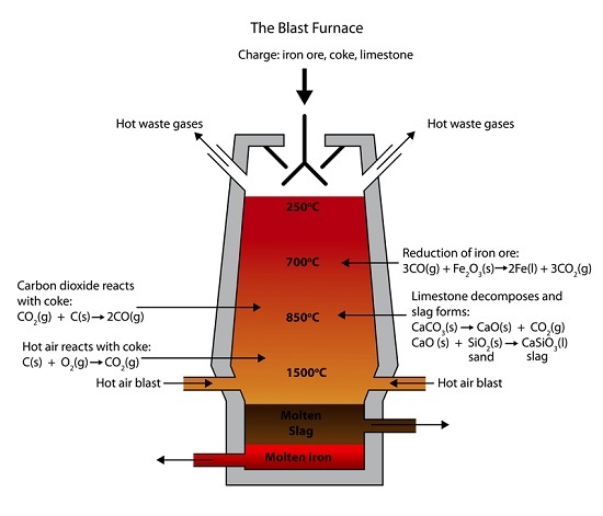 **从富集矿石中提取铁** - 富集矿石后,**铁**通过与石灰石和焦炭反应提取。此过程借助**高炉**完成。在**高炉**顶部加入富集矿石、焦炭和石灰石等化合物。然后从**高炉**底部吹入热空气。此过程需要高温,焦炭燃烧产生一氧化碳。