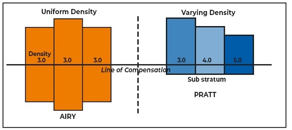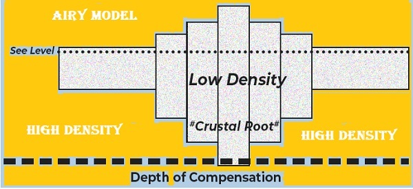 他们沿着普拉特的思路阐述了这个概念。根据他们的说法,地壳各柱的高度与其各自的密度(如普拉特假设的那样)之间存在反比关系,这与补偿线有关。他们假设补偿面位于地下100公里处。密度较低的柱子比密度较高的柱子高。
