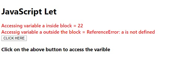 sampleEle.innerHTML = "Accessing variable a outside block = " + a;