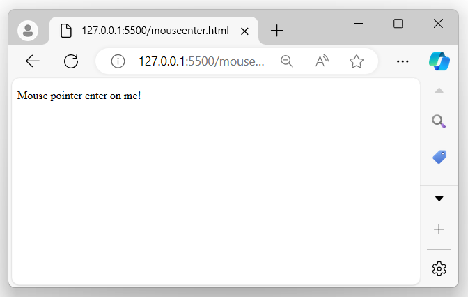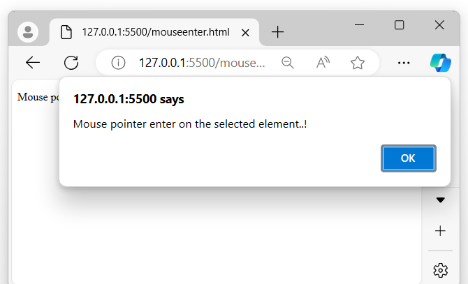 以上程序会在鼠标指针进入(或悬停)显示的消息时显示一条消息,浏览器屏幕上会出现一个弹出警报: