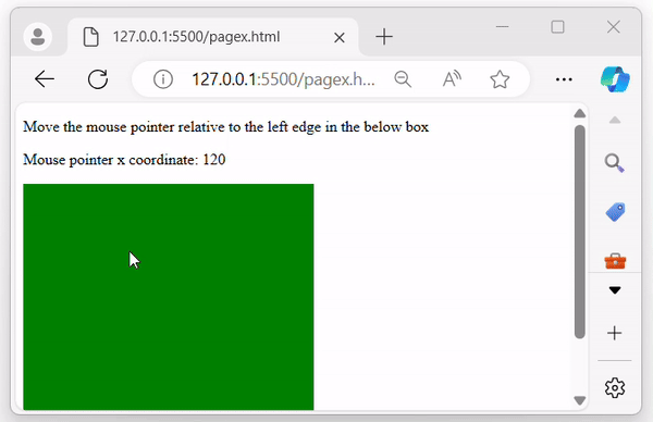 以下是使用 jQuery event.pageX属性的另一个示例。我们使用此属性查找特定区域内鼠标指针的 X 坐标: