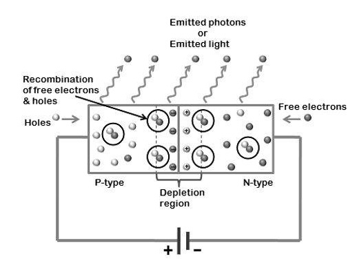 发光二极管 (LED) 仅在正向偏置条件下工作,其中自由电子来自 N 端,空穴来自 P 端被推向结。自由电子和空穴的复合发生在耗尽区以及 P 型和 N 型半导体中。导带中的自由电子在与价带中的空穴复合之前,会以光的形式释放能量。