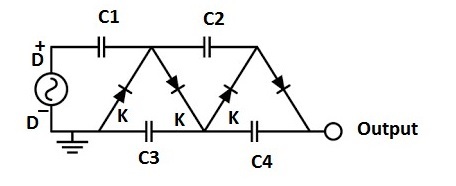 通过接下来的两个整流器与其他电容器共享电荷。此过程持续到所有电容器完全充电为止。在这种情况下,柱上下端的电压差等于每个电容器电压的总和。因此,可以通过增加两个导体中电容器的数量来获得所需的高电压,因此称为电压倍增器。输出将在 DD 之间获取。
