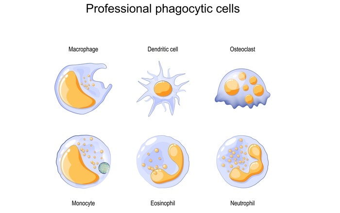 另一方面,枯否细胞是专门的巨噬细胞,起源于胎肝祖细胞,负责过滤肝脏中的血液。专业吞噬细胞是免疫细胞,专门识别和吞噬外来颗粒,例如细菌、病毒和碎片,这一过程称为吞噬作用。