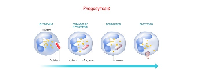 吞噬作用是专业吞噬细胞吞噬和消化外来颗粒(如细菌、病毒和细胞碎片)的过程。吞噬作用的过程涉及一系列协调事件,使识别、吞噬和降解外来颗粒成为可能。其中包括 -