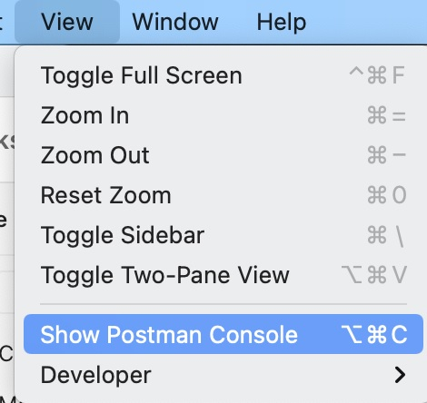 步骤 4 − 通过单击视图->显示 Postman 控制台打开 Postman 控制台。
