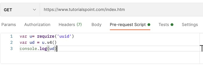 步骤 2 − 在请求前脚本选项卡下添加以下脚本 −