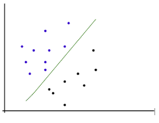 如上图所示,所有数据观测值都绘制在二维图中,其中X轴表示自变量或训练数据,Y轴表示目标变量。绘制一条线来分离正负数据观测值。根据算法,落在线以上的数据点被视为正数据点,落在线以下的数据点被视为负数据点。