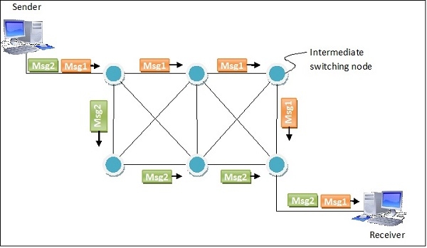 在交换节点中,如果所需的输出电路繁忙,则不会丢弃传入的报文。相反,它将存储在该路由的队列中,并在所需路由可用时重新传输。这称为存储转发网络。