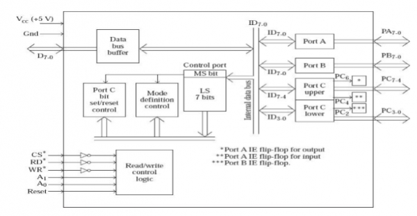 在模式 0 或模式 1 中,端口充当输入端口或输出端口。这取决于输入设备或输出设备是否连接到端口。此外,这种模式 2 通常被称为双向握手输入输出。当微处理器接收信息,有时也将信息发送到连接到 8255 的输入输出设备时,它对我们很有益。例如,可以引用与软盘控制器卡的通信过程。由于模式 2 是双向握手输入输出,因此它需要的握手线比单向模式 1(即锁存输入输出)多。