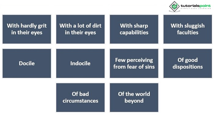在获得解脱之后,苦行僧乔达摩被称为佛陀。佛陀为了出于慈悲传播佛法,首先考察了世界。 《中部》的《阿利耶婆利耶苏达》描述了佛陀如何看待具有许多正面和负面特质的众生,包括: