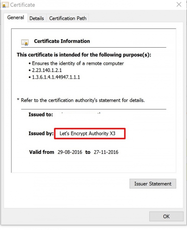 现在我们可以看到证书信息以及Let's Encrypt Authority颁发的证书。