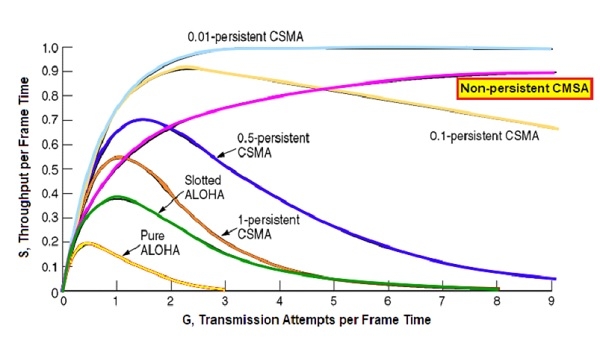 网络系统的吞吐量定义为每帧时间成功传输的次数。下图比较了非持久性CMSA与其他MAC协议的吞吐量。