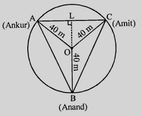 一个半径为40米的圆形公园位于一个居民区内。三个男孩安库尔、阿米特和阿南德坐在公园边界上等距的位置,每个人手里都拿着一个玩具电话互相交谈。