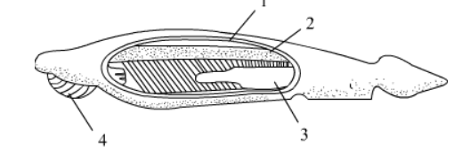 (1.) 神经索 (2.) 脊索 (3.) 围鳃孔 (4.) 口笠