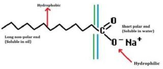 - 肥皂分子的另一端(短的极性端)是羧酸根离子,它是亲水的,即溶于水但不溶于油。