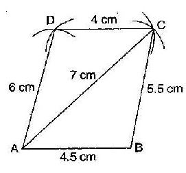 构造四边形ABCD。AB等于4.5厘米,BC等于5.5厘米,CD等于4厘米,AD等于6厘米,AC等于7厘米。