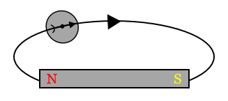 复制下图,图中显示了一个罗盘和一块磁铁。标记磁铁的N极,并在罗盘指向的方向上画出磁感线。