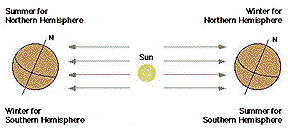 6月,北半球是夏季,因为那时太阳光线比其他任何时候都更直接地照射到地球的一部分。12月,北半球是冬季,因为那时轮到南极向太阳倾斜。