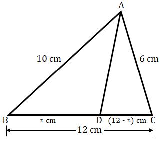 在三角形ABC中,AD是∠A的角平分线,与边BC交于点D。如果AB = 10 cm,AC = 6 cm,BC = 12 cm,求BD和DC。
