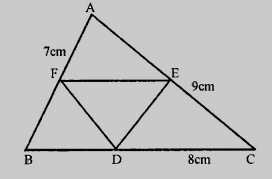 在△ABC中,D、E和F分别是BC、CA和AB的中点。如果边AB、BC和CA的长度分别为7厘米、8厘米和9厘米,求△DEF的周长。