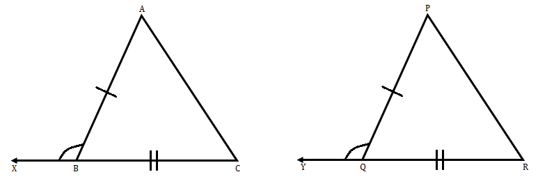 在△ABC和△PQR中,AB = PQ,BC = QR,CB和RQ分别延长到X和Y,且∠ABX = ∠PQY。证明△ABC ≅ △PQR。